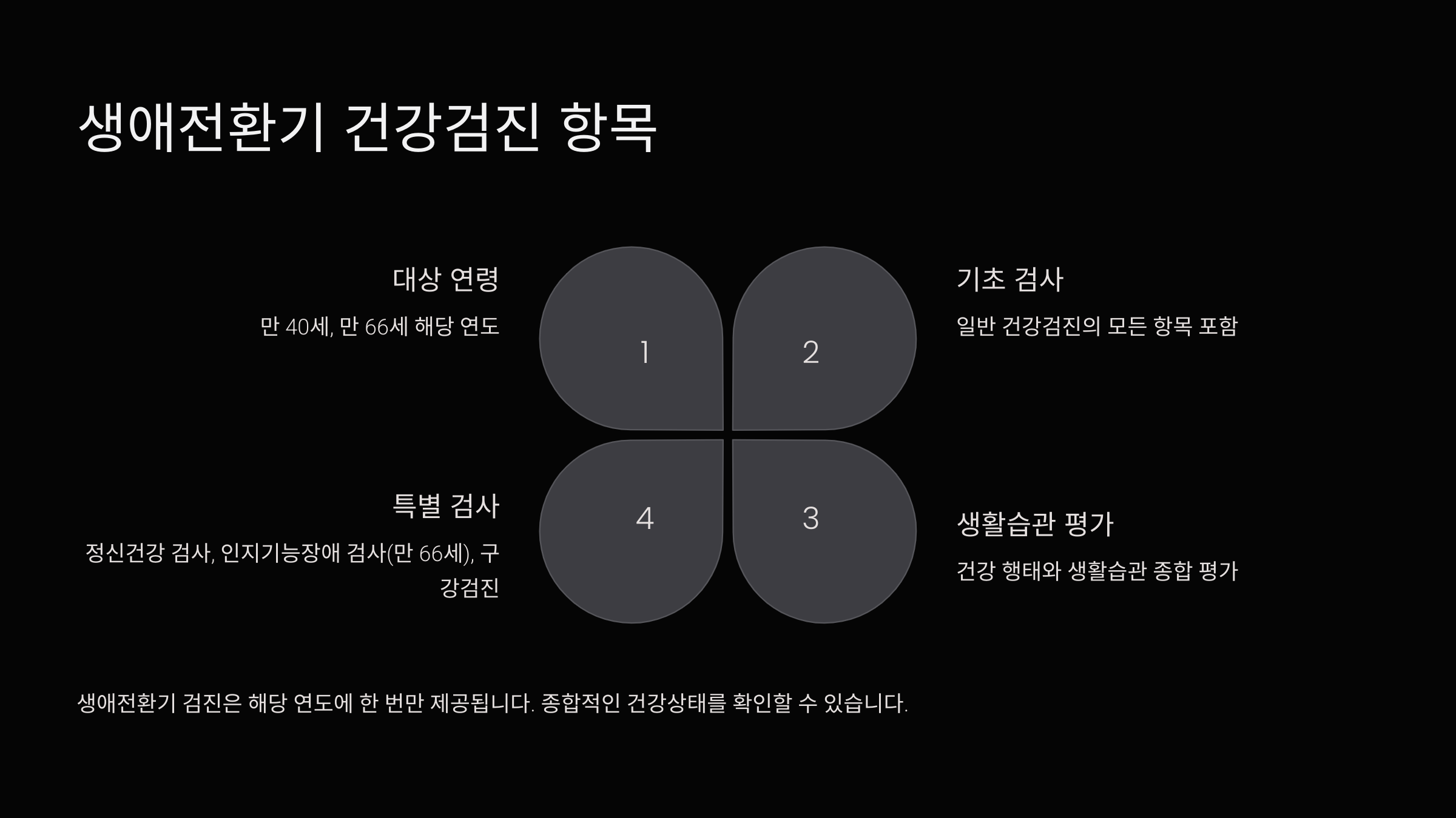 생애전환기 검진은 해당 연도에 한 번만 제공되며, 종합적으로 건강상태를 체크해볼 수 있어요.