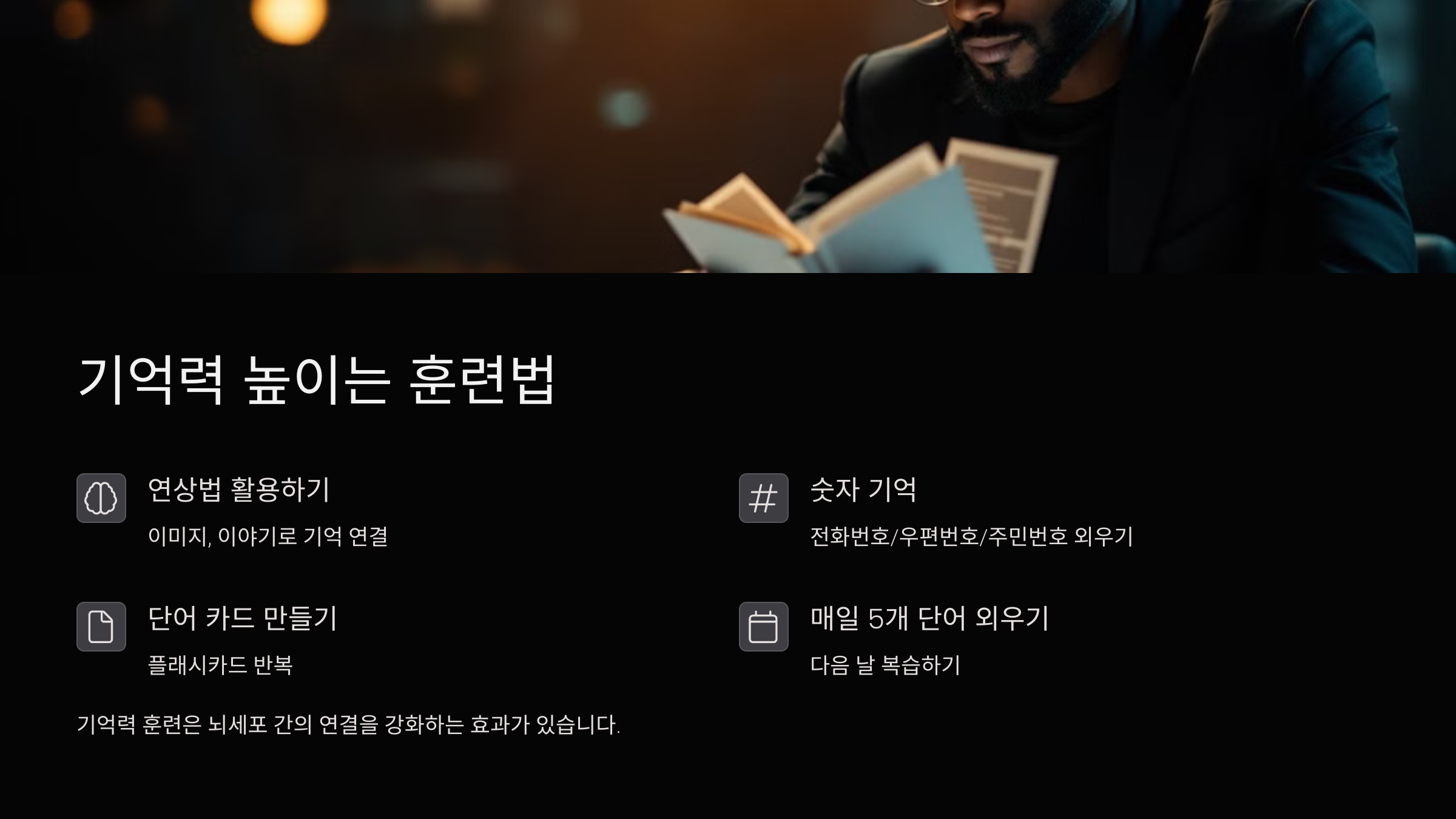 기억력 훈련은 뇌세포 간의 연결을 강화하는 효과가 있어서 전체적인 두뇌 회전력에도 긍정적인 영향을 줘요.