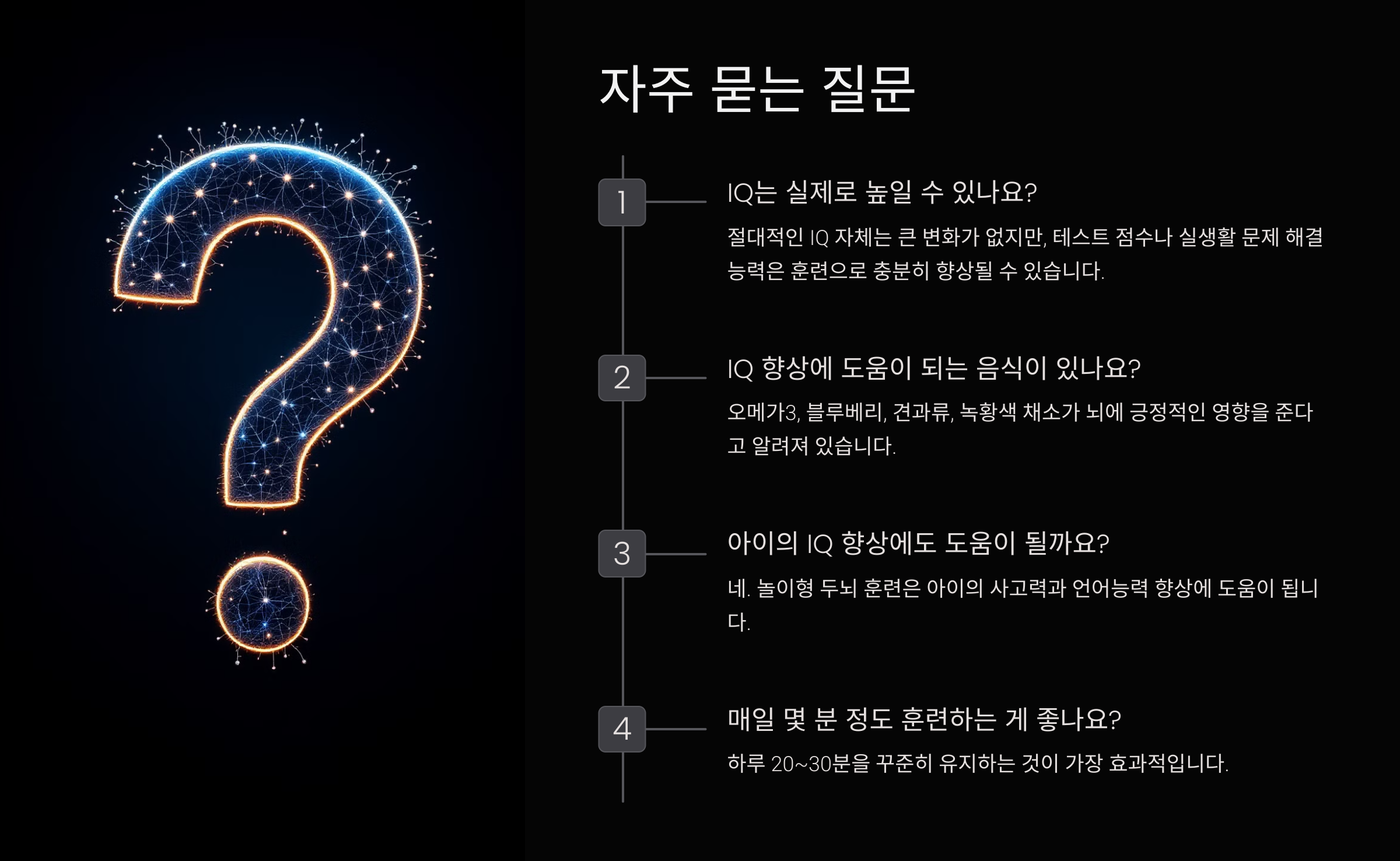A1. 절대적인 IQ 자체는 큰 변화가 없지만, 테스트 점수나 실생활 문제 해결 능력은 훈련으로 충분히 향상될 수 있어요.
