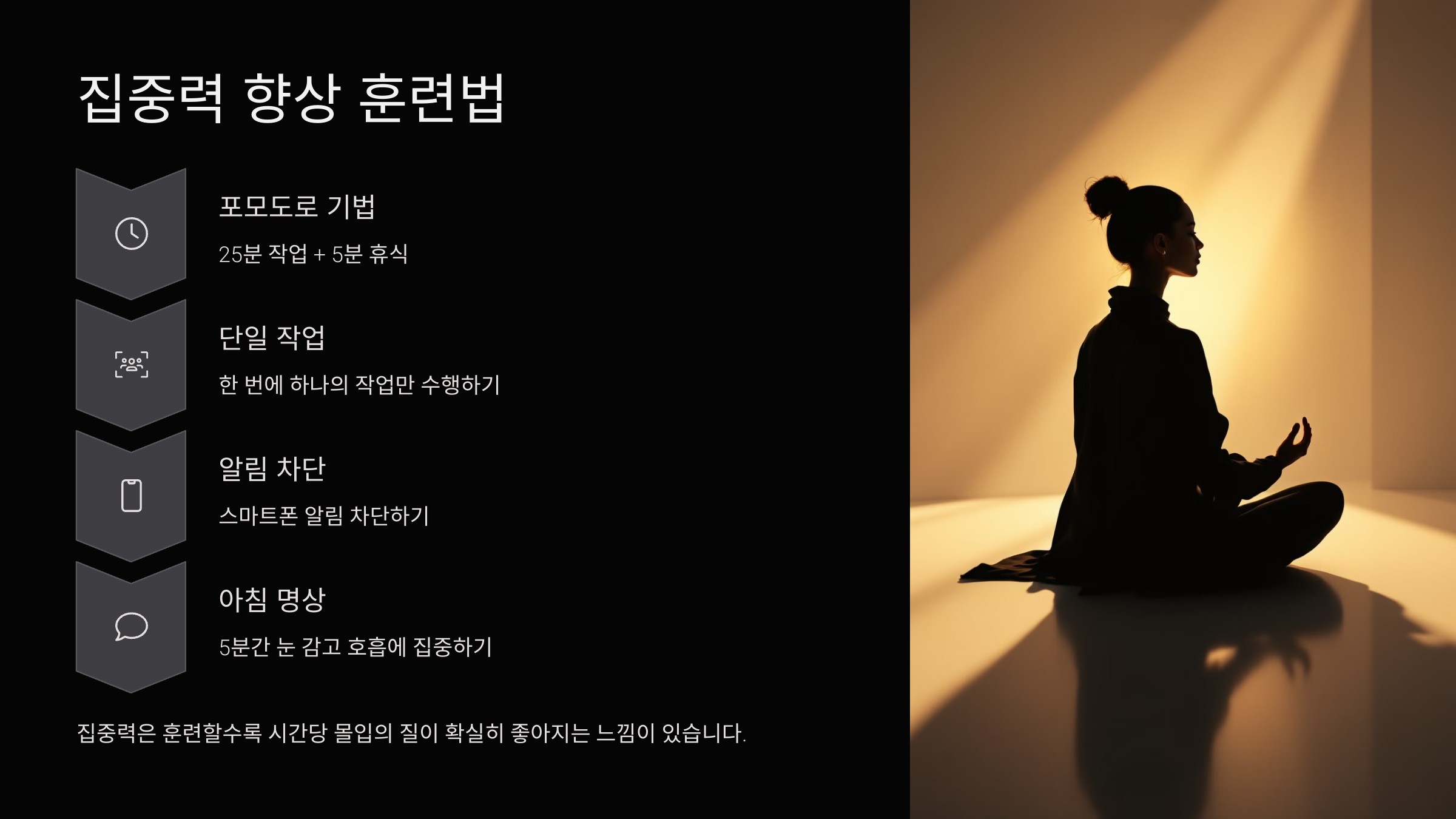 내가 생각했을 때 집중력은 훈련할수록 시간당 몰입의 질이 확실히 좋아지는 느낌이 있어요.